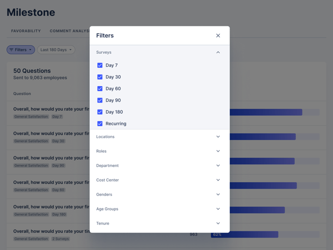 Each survey will ask your employees a unique set of questions to collect their feedback on topics that matter most according to their tenure. Answers and feedback are organized in-platform for users to review, and in most places are able to be filtered by particular milestones in order to convey data specific to each milestone.